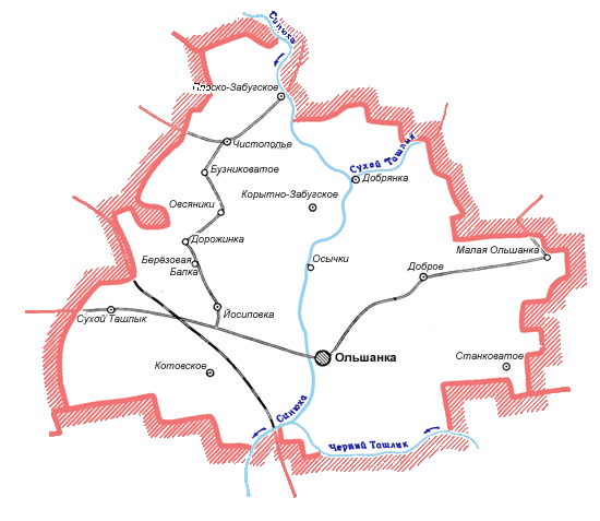 В состав Ольшанского поселкового совета входят села Калмазово и Осычки.