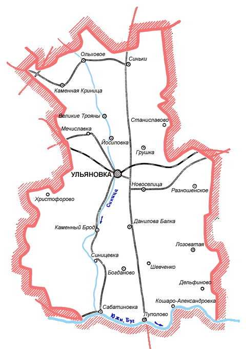 На западе он граничит с Гайворонским, на востоке - с Голованевским районом Кировоградской области, на севере - с Уманским районом Черкасской области. С юга от Савранским районом Одесской области и Кривоозерским районом Николаевской области.