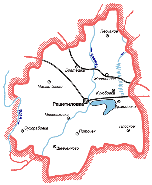 Решетиловка – поселок городского типа, центр Решетиловского района и Решетиловского поселкового совета, в который, кроме того, входят сёла Белокони, Варвянское, Ганжи, Колотии, Прокоповка, Сени, Слюсари, Хоружи, Шкурупиевка и Чернещина.